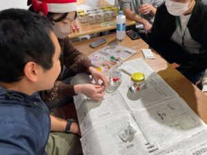 2025年12月21日(日)14時から 17時まで、十号通り商店街のコミュニティースペース「笹塚十号のいえ」にて、オリジナルスノードーム作りとコーンホールを実施しました。