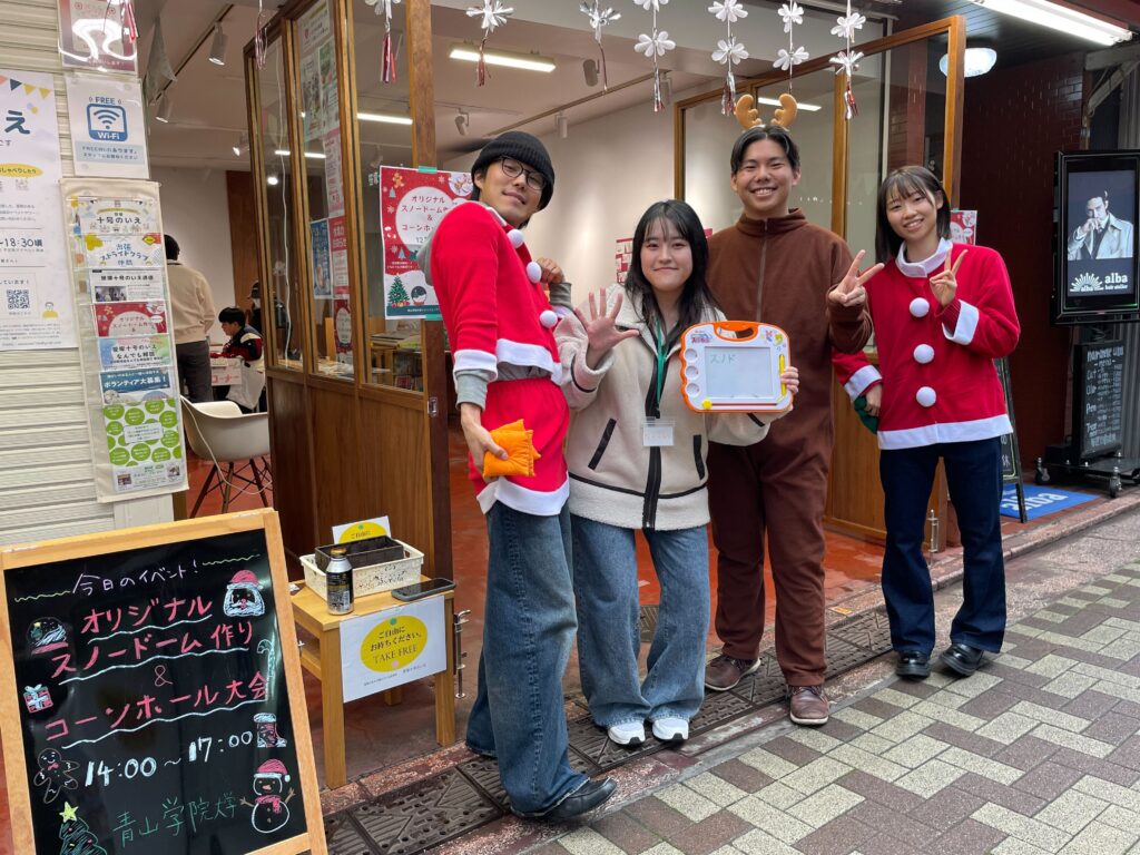 12 月の開催ということもあり、クリスマスをテーマに企画しました。スノードーム作りは一度に制作できる人数が限られているため、待ち時間も楽しんでいただけるよう、呼び込みも兼ねてコーンホールを屋外で実施しました。また、「青学生といえばコーンホールのイベントを行っている」という印象を持っていただけるよう、定番企画として継続的に実施することで、コミュニティづくりにつなげたいと考えました。